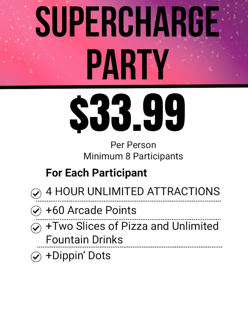 You’re free to start your attractions anytime on the day of the party, but we suggest starting before your table time. Oh, and don’t forget to order your food at check-in!